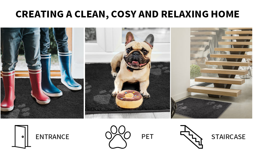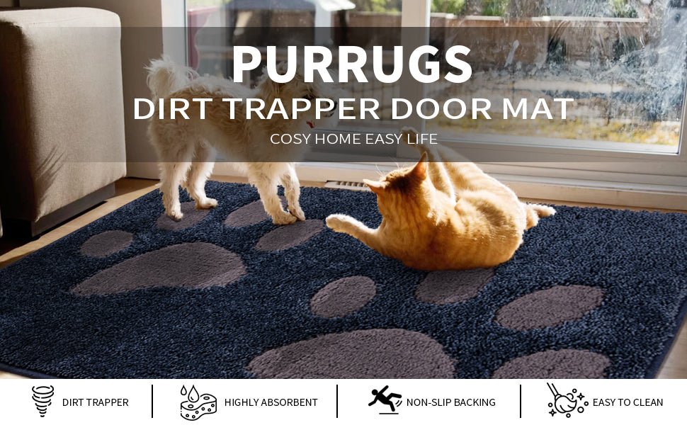 You need PURRUGS indoor door mats to make a difference. Their soft, dense polyester piles can effectively trap dirt, dust and moisture from muddy boots and paws, helping you keep your floor clean and shiny.